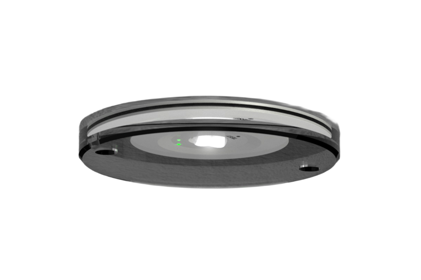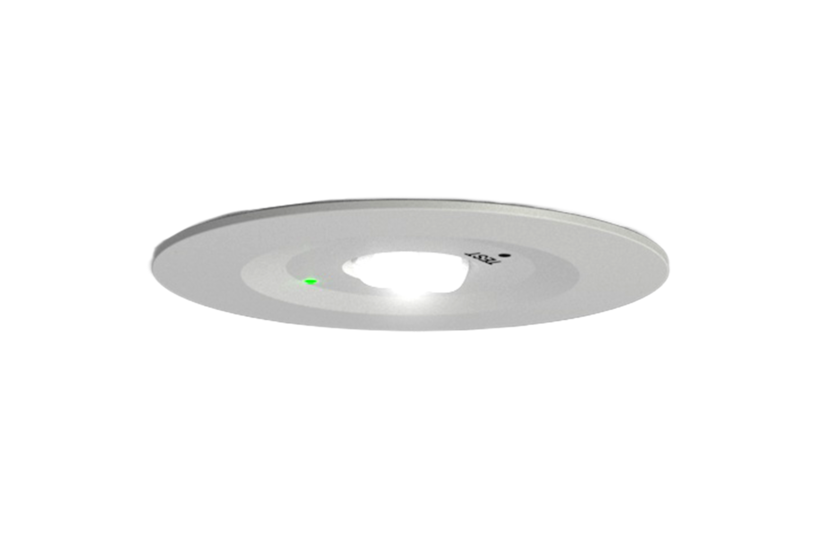 Runde Deckeneinbaubatterieleuchte mit asymmetrischer Optik bis 4,5m Montagehöhe, abgesetzte LED-Versorgung.