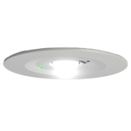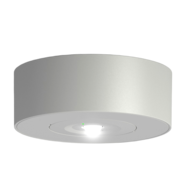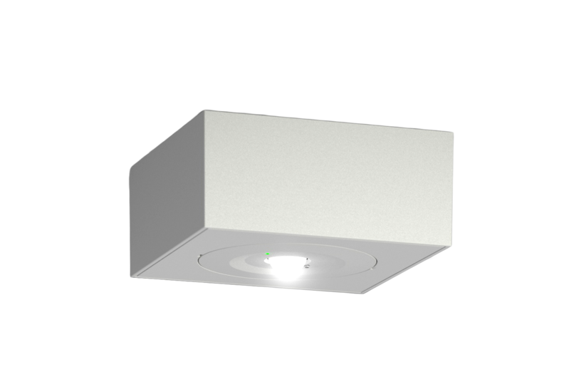 Quadratische Deckenaufbaubatterieleuchte mit symmetrischer Optik bis 4,5m Montagehöhe, LED-Versorgung.