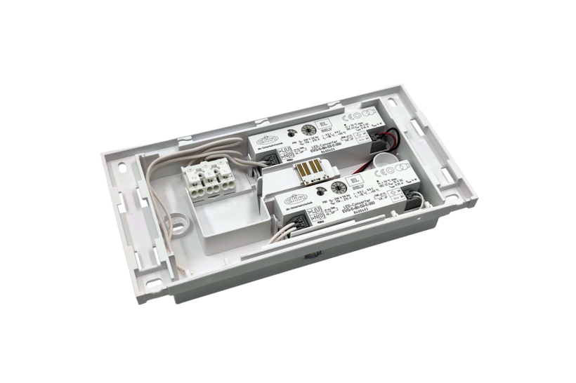 Wandaufbaumontageset mit zusätlich integriertem und schaltbarem Sicherheitslicht, inkl. LED-Versorgung, ohne Piktogramm.