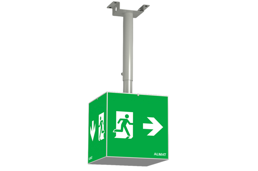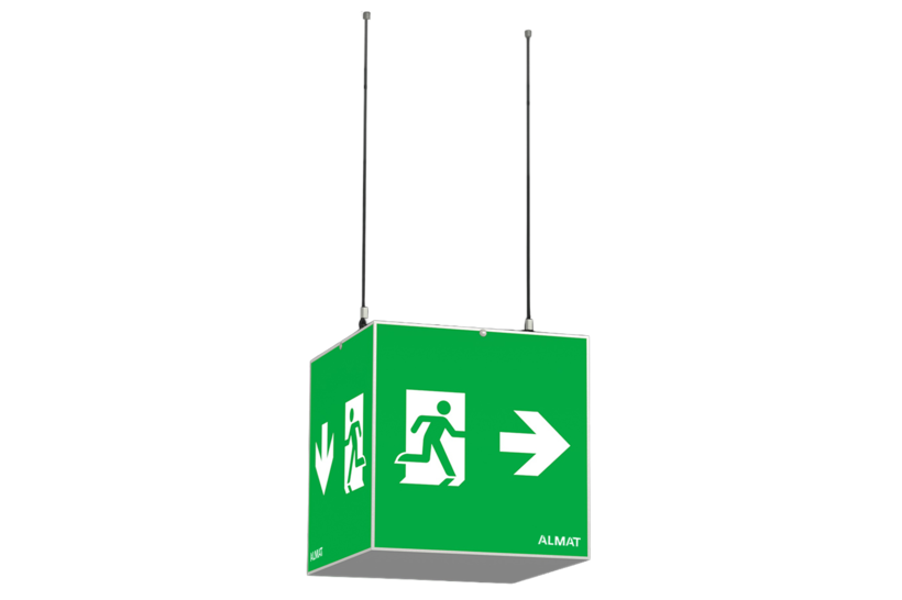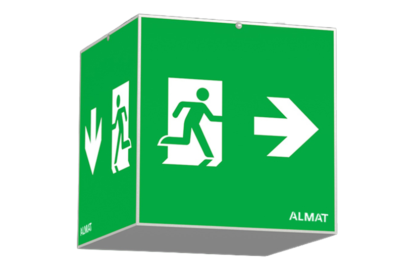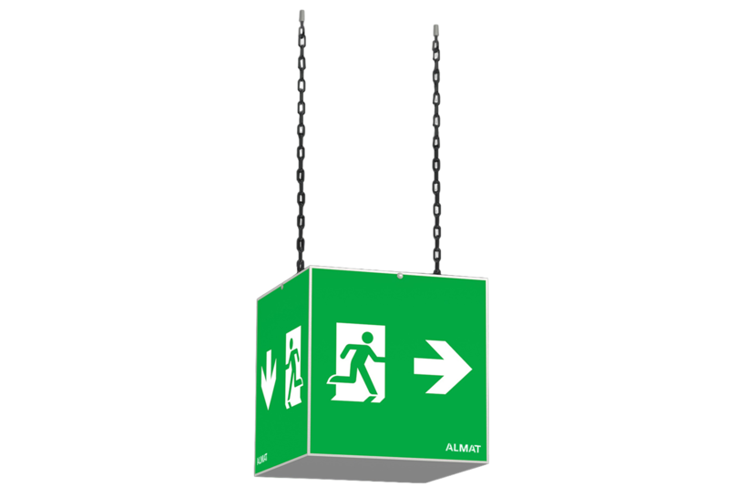 Würfelförmige Rettungszeichenleuchte, inkl. LED-Versorgung, mit Plexiglashaube plus Piktogrammen Pfeil links, Pfeil unten und Pfeil rechts gem. ISO 7010.