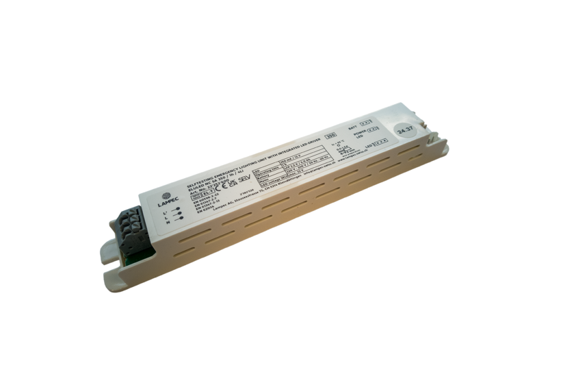 Notlichtelement mit eingebautem LED-Treiber 700mA im Netzbetrieb, Konstantstromregelung, 1h Notbetriebsdauer mit zweizelligem LiFePO4-Akkumulator, Selbsttest nach EN 62034