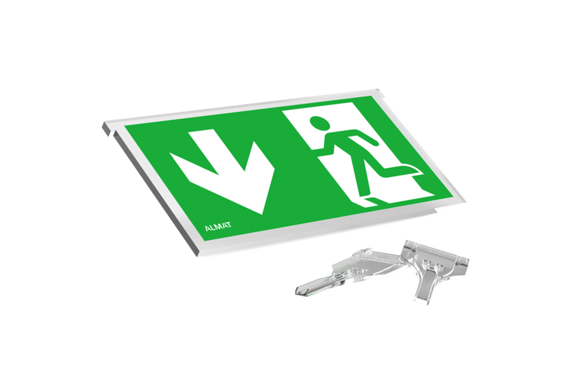 Piktogrammscheibe Pfeil unten für SIMPLEMENT Deckenaufbau, gem. ISO 7010, Erkennungsweite 32 m mit ALMAT Logo.