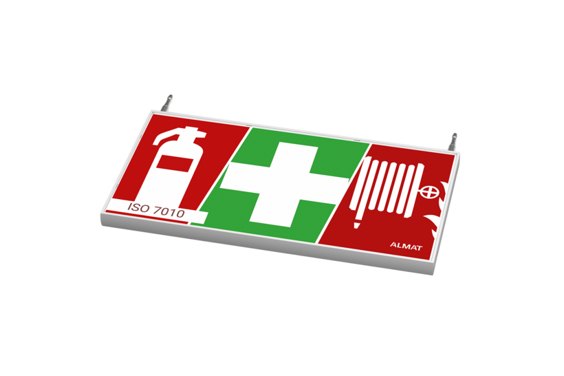 Piktogramm mit ISO 7010 Zeichen für STELLA 2 Deckenauf- oder Deckeneinbau, Erkennungsweite 32 m mit ALMAT Logo.