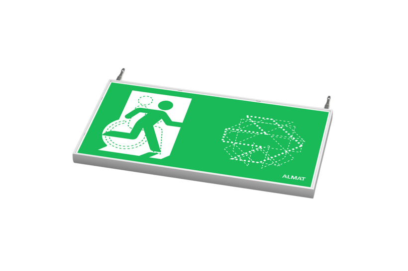 Piktogrammscheie gemäss spezifischen Vorgaben für STELLA 2 Deckenauf- oder Deckeneinbau, gem. ISO 7010, Erkennungsweite 32 m mit ALMAT Logo