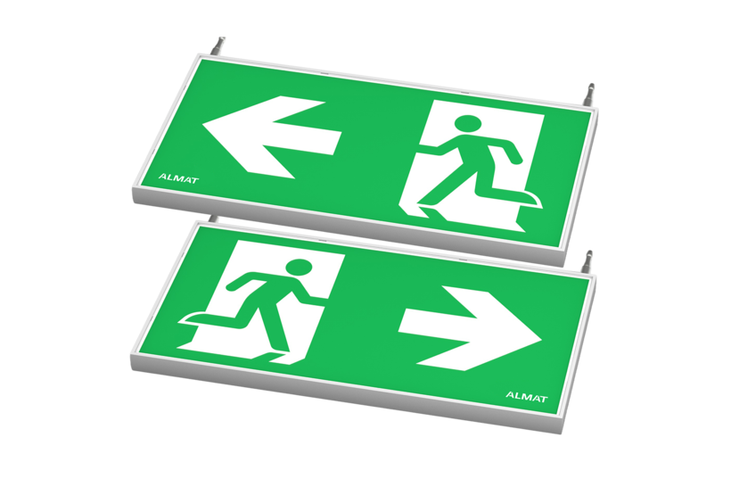 Piktogrammscheie mit Pfeil links/Pfeil rechts für STELLA 2 Deckenauf- oder Deckeneinbau, gem. ISO 7010, Erkennungsweite 32 m mit ALMAT Logo