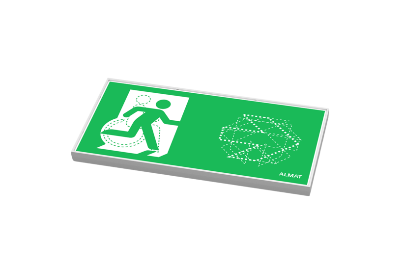 Piktogrammscheie gemäss spezifischen Vorgaben für STELLA 2 Wandaufbau, Piktogramm gem. ISO 7010, Erkennungsweite 32 m mit ALMAT Logo.