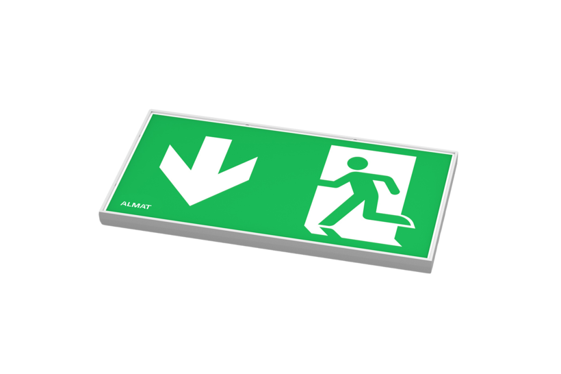 Piktogramm Pfeil unten für STELLA 2, Scheibe mit Piktogramm gem. ISO 7010, Erkennungsweite 32 m mit ALMAT Logo
